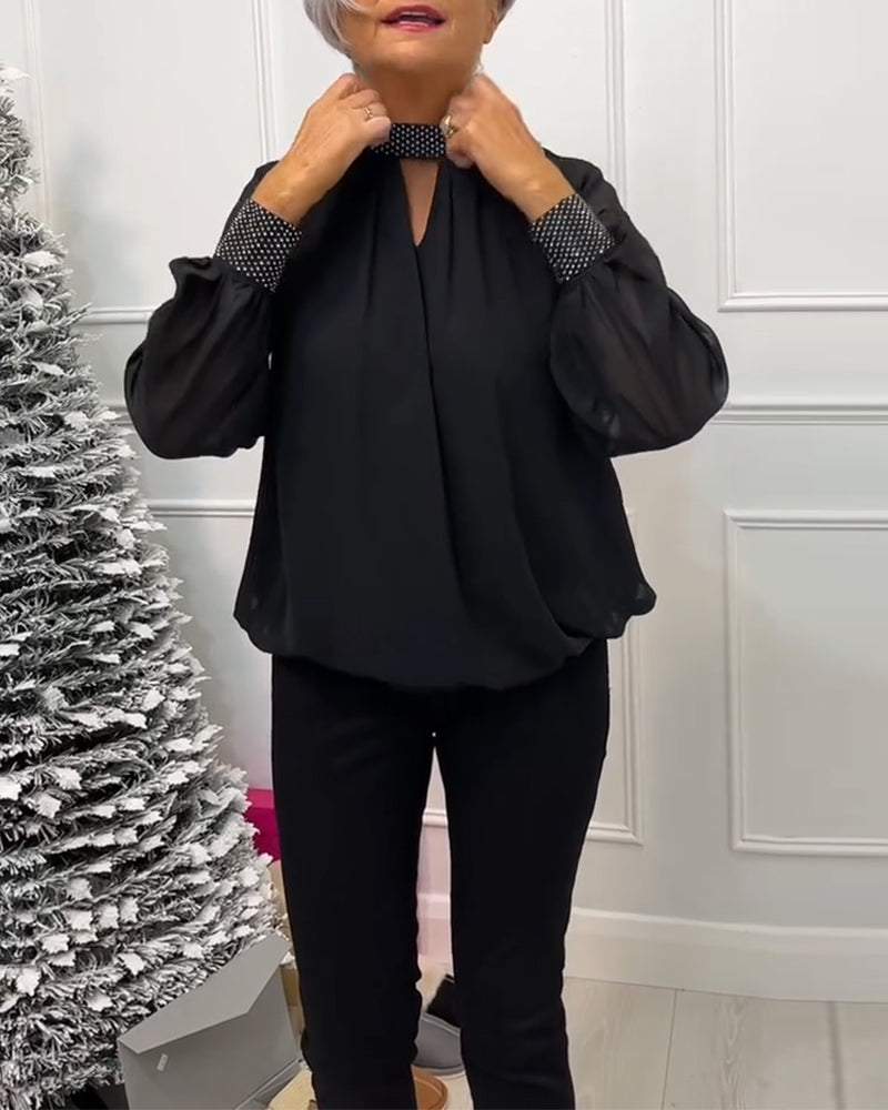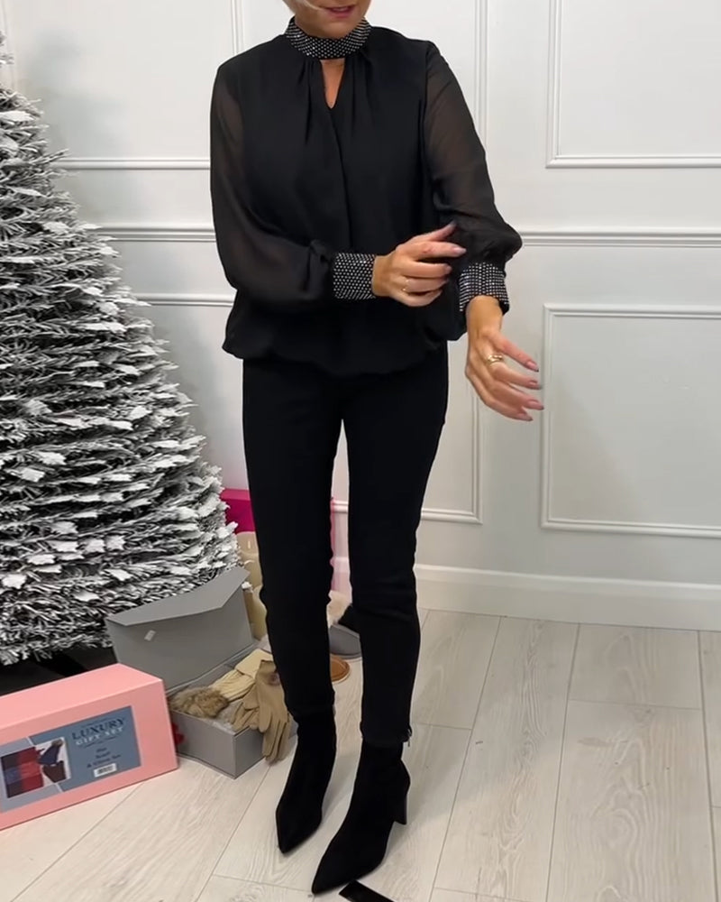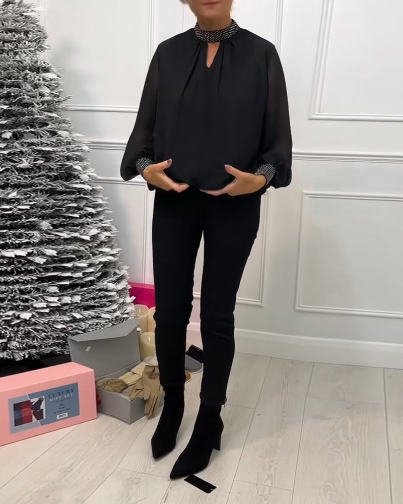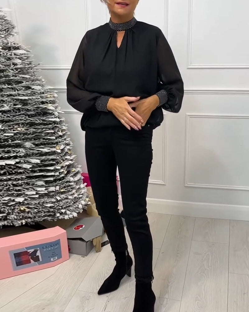 Fashion solid color stand collar patchwork hollow blouse